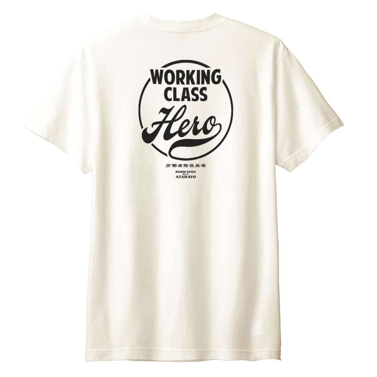 労働者階級の英雄を意味する「WORKING CLASS HERO」のロゴをプリントしたTシャツです。あまり見かけないアイボリーのボディにマットブラックのプリントカラーは意外に合わせやすくクセになります。