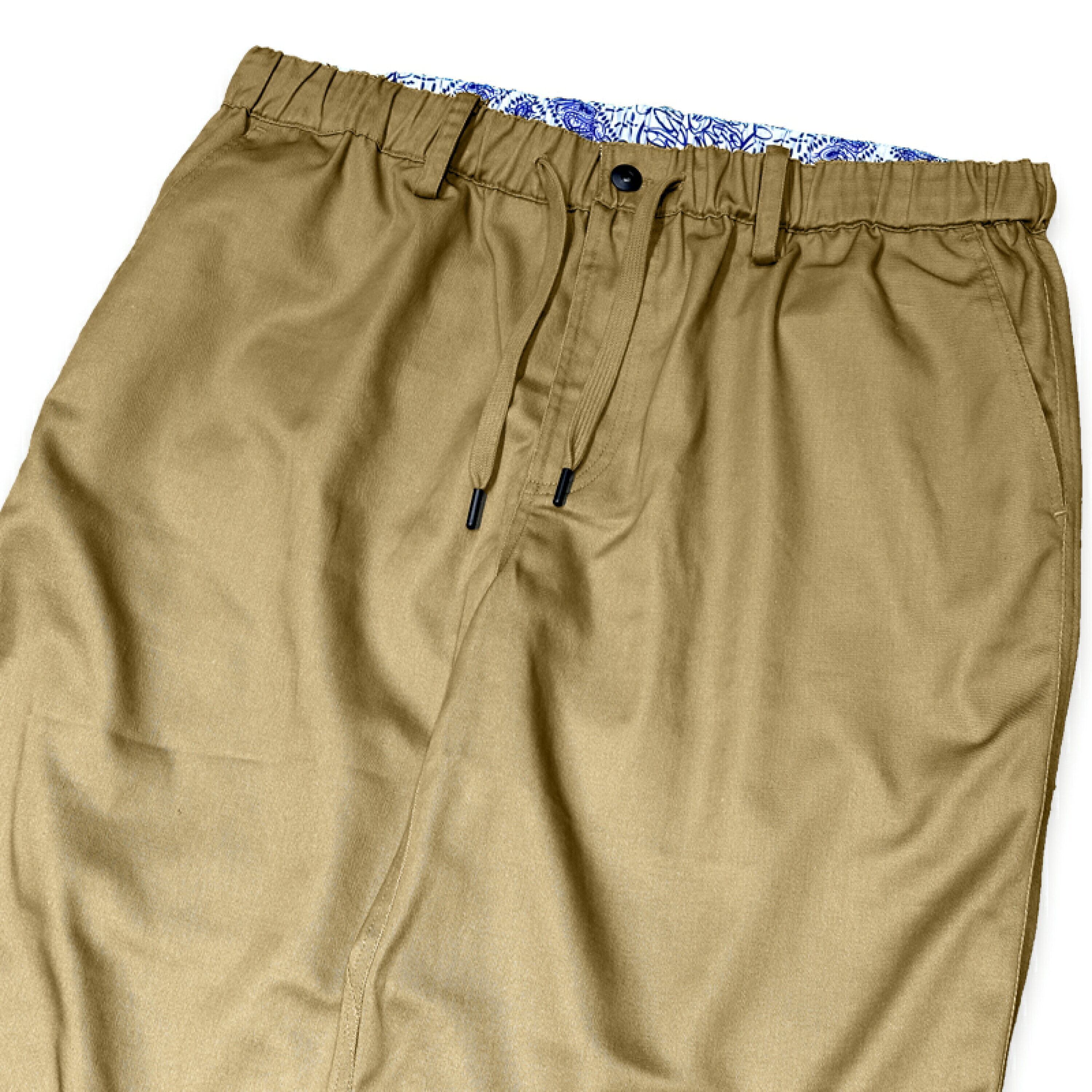 ゆったりシルエットのウエストゴム+紐イージーパンツタイプで、ベルトループ付き。普段使いからカルチャースタイルまで幅広く活躍します。
